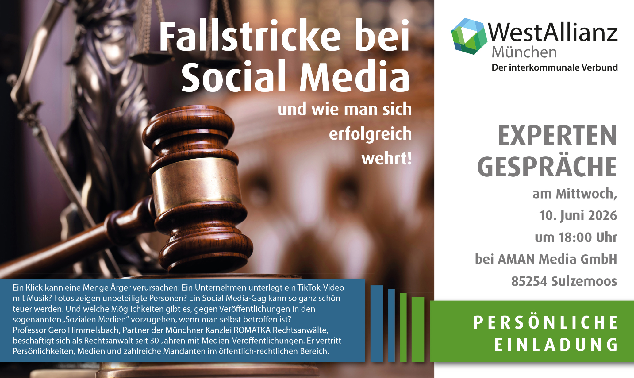 Ein Klick kann eine Menge Ärger verursachen: Ein Unternehmen unterlegt ein TikTok-Video mit Musik? Fotos zeigen unbeteiligte Personen? Ein Social Media-Gag kann so ganz schön teuer werden. Und welche Möglichkeiten gibt es, gegen Veröffentlichungen in den sogenannten „Sozialen Medien“ vorzugehen, wenn man selbst betroffen ist? Professor Dr. Gero Himmelsbach, Partner der Münchner Kanzlei ROMATKA Rechtsanwälte, beschäftigt sich als Rechtsanwalt seit 30 Jahren mit Medien-Veröffentlichungen. Er vertritt Persönlichkeiten, Medien und zahlreiche Mandanten im öffentlich-rechtlichen Bereich.